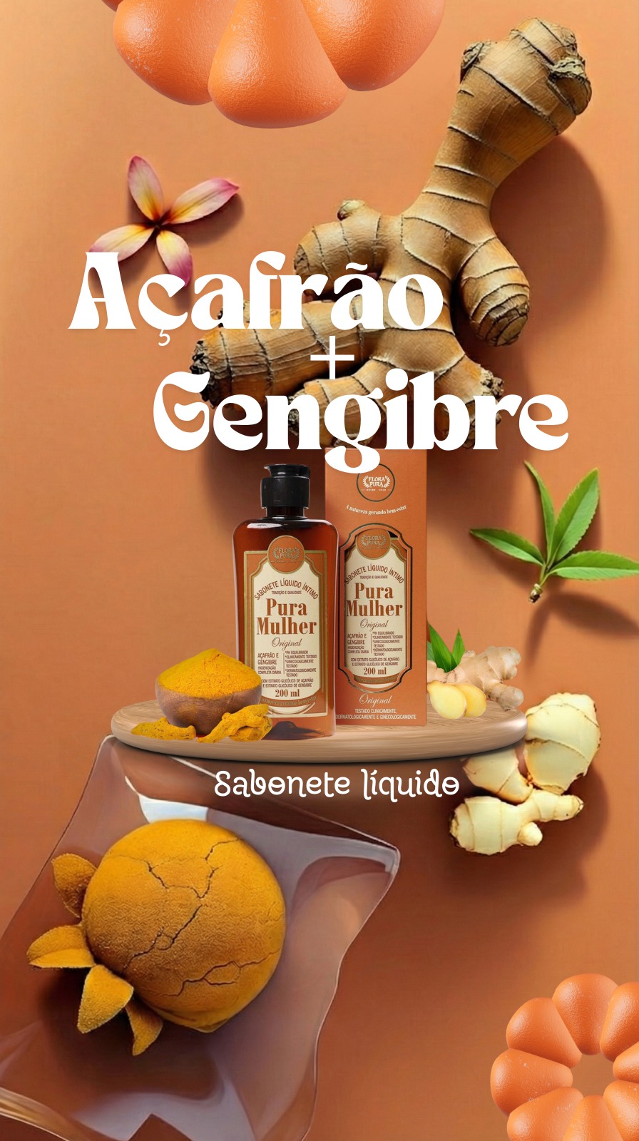 🌿 Açafrão e Gengibre – Purifica, refresca e protege com o poder antioxidante e revigorante desses ativos naturais.