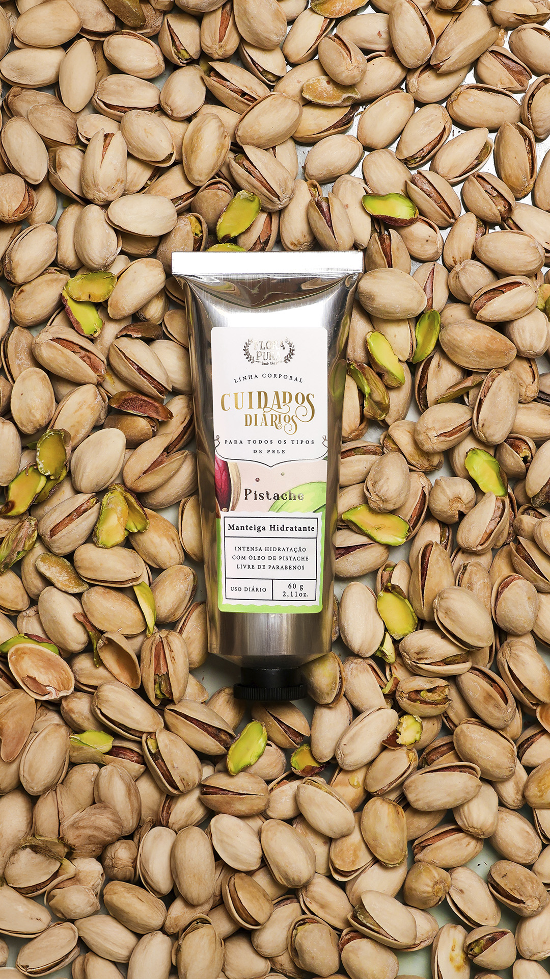manteiga de karité e óleo de pistache, forma uma barreira protetora sobre a pele,